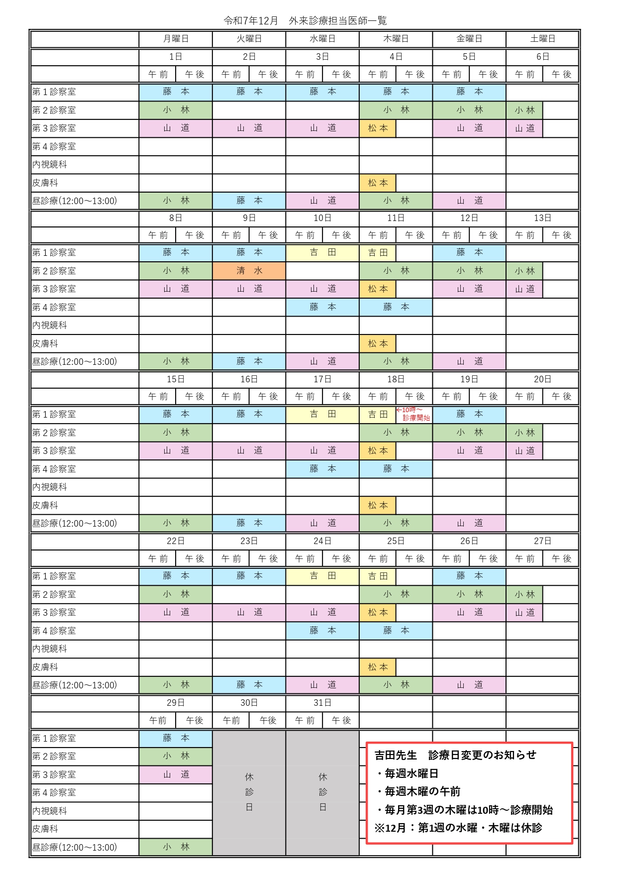 - 山道医師の外来は、毎週木曜日は出張のため休診になります。
